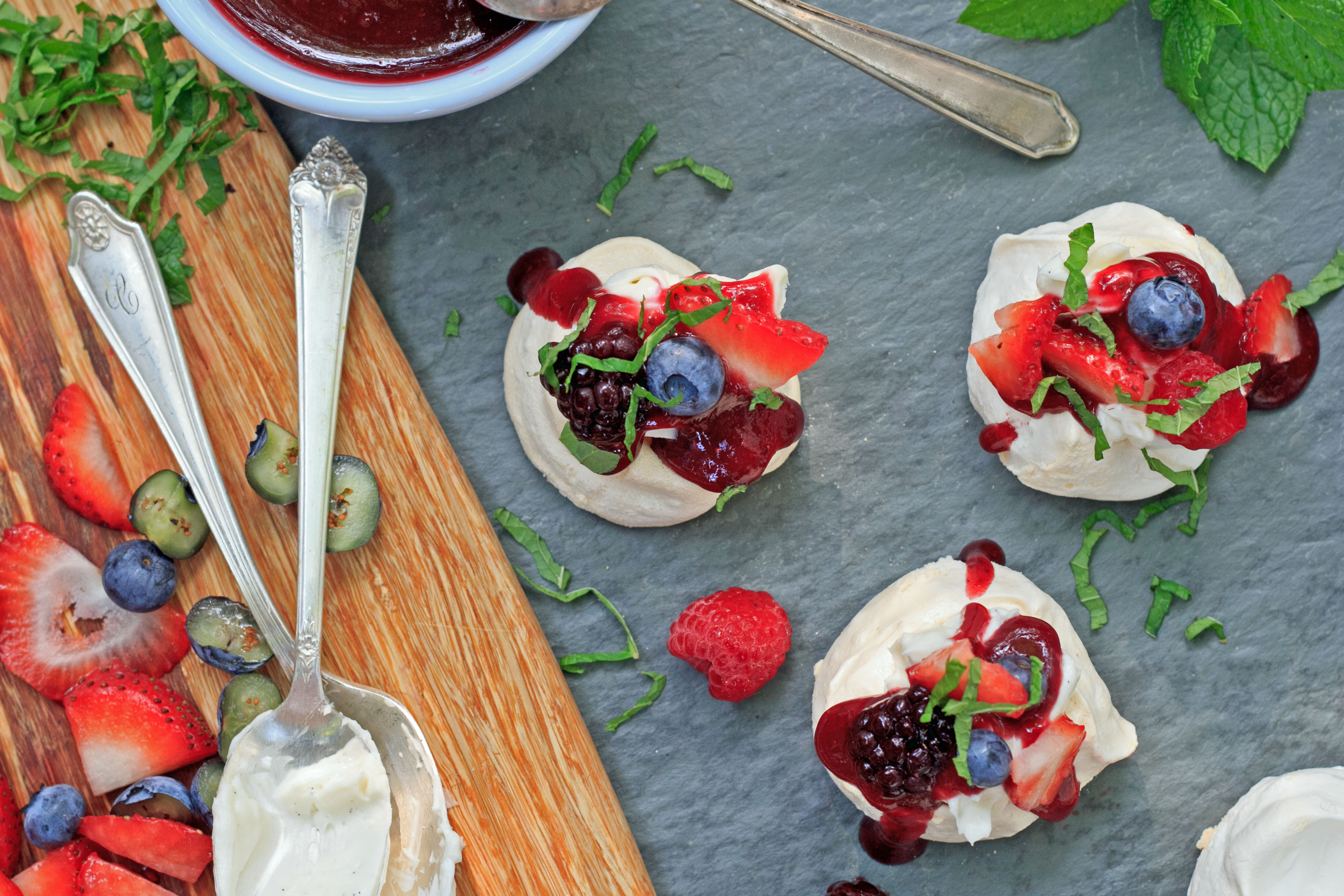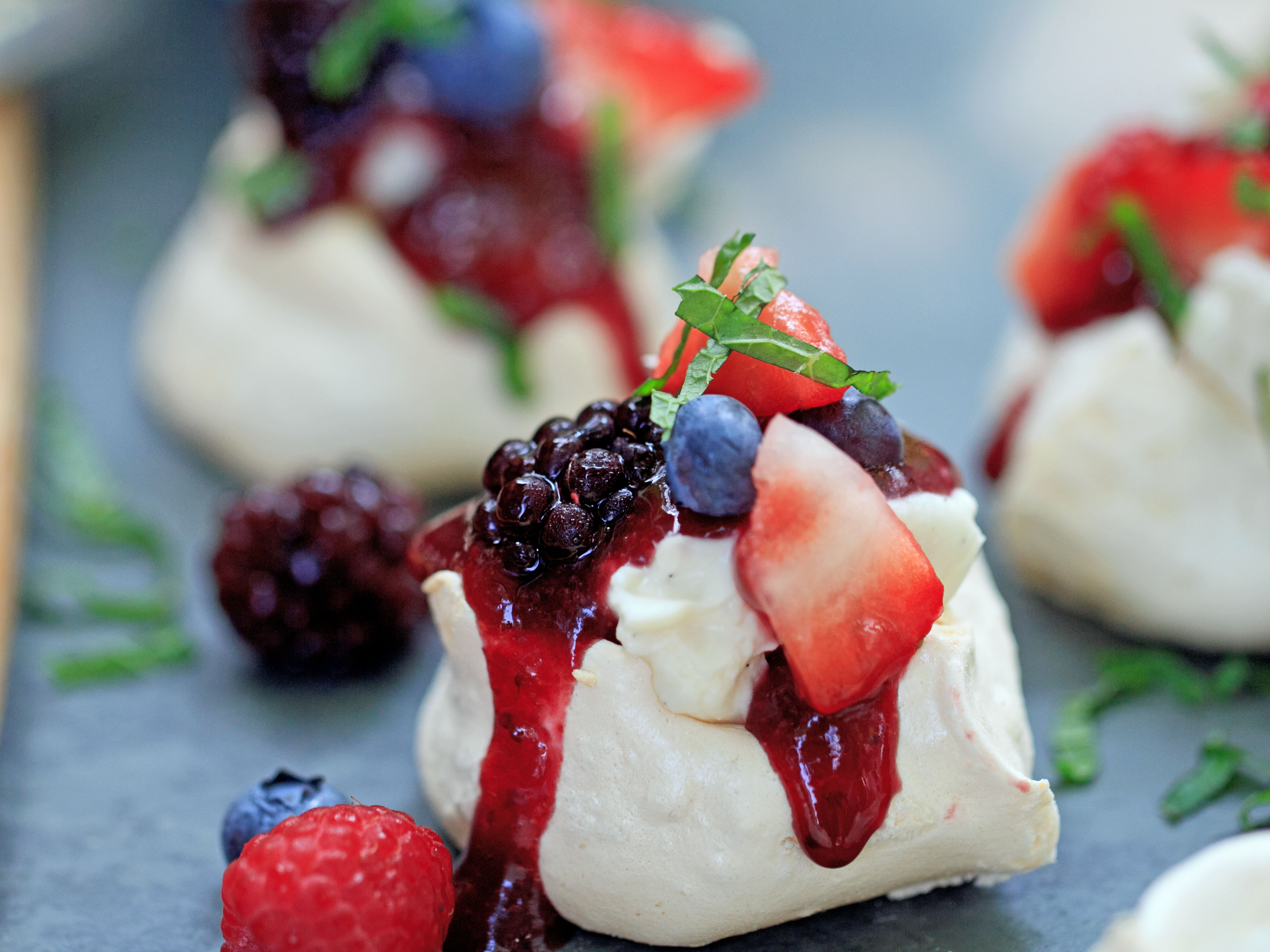 - To assemble, place the meringues on a serving platter. Fill the centers with a generous dollop of vanilla cream. Spoon the berry sauce on top. Sprinkle with mixed berries and fresh mint or tarragon. Serve immediately.