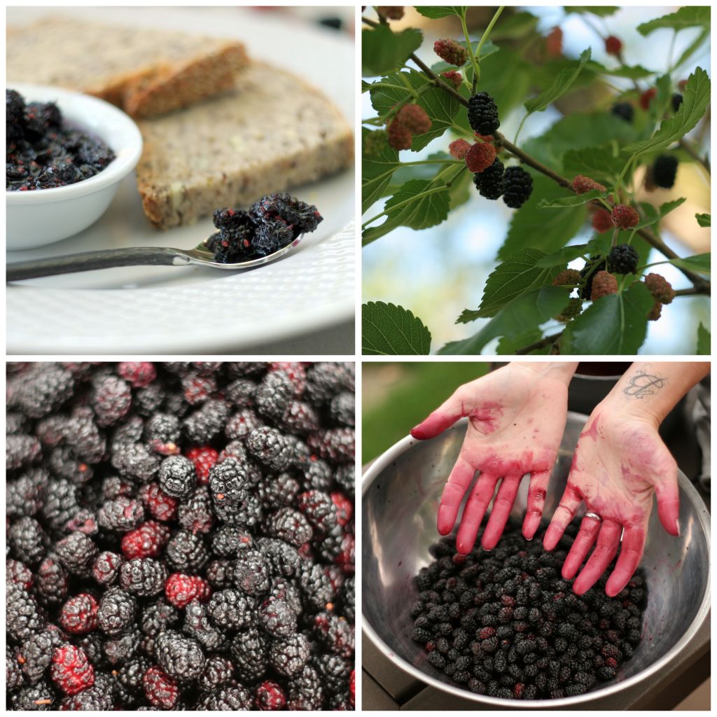 For three weeks each summer the north east corner of our back yard is covered in mushy, rotting mulberries that drop from our neighbor’s tree. Worse still is the gritty, indigo mulberry bird poo that splops onto every chair and table in the yard. As Eckhart Tolle is fond of saying, that which you resist, persists. So this year, further inspired by the renowned forager Euell Gibbons, I decided to stop resisting and make some jam. It took me ten years to do something useful with the berries, but only a few moments to regret it – the jam was delicious!