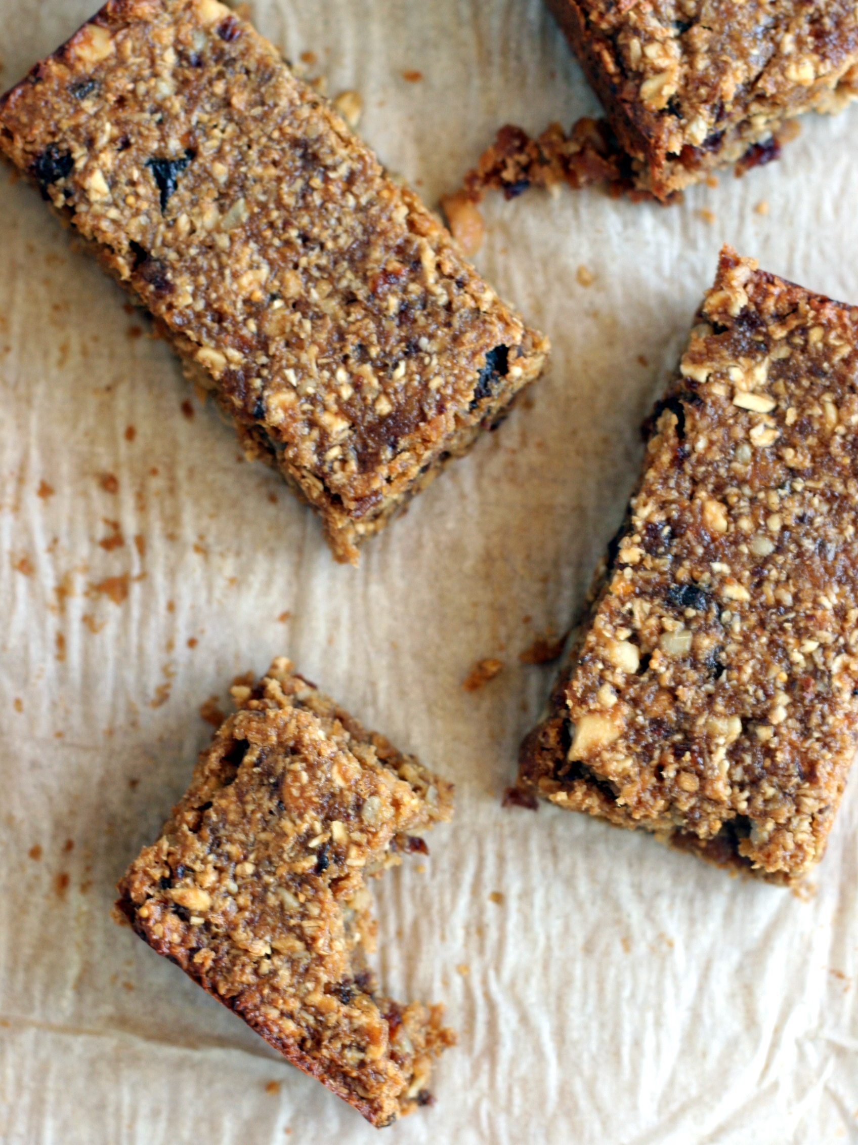 My favorite way to perpetuate the chaos is to experiment in the kitchen the day before we’re set to leave. (Yes, Greg finds that maddening until he’s somewhere in the middle of I-80 noshing on a homemade goodie.) When I should be tracking down that darn purse that matches my sparkly black go-out shoes, the one I haven’t seen since the last wedding we went to a year ago, I’m instead pouring over notes for a new granola bar. I’m suddenly over my go-to granola bars, the ones I can make without a recipe or an oven, the ones that Greg loves even though we both agree they’re a bit too sweet at times. I wanted a slightly savory bar that would do double duty as both a filling snack and a breakfast bar. These tasty treats fit the bill. They pack a punch with enough protein to keep you going from breakfast until lunch without a single hunger pang.