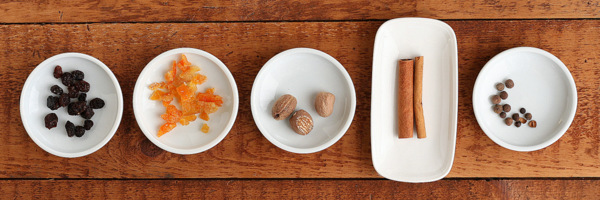 3. In a large mixing bowl, whisk together the dry ingredients. Stir in the raisins and candied citron. Make a well in the center.
