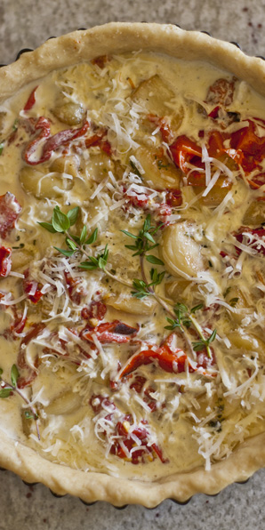 6. To assemble the tart, crumble the feta cheese and scatter it over the bottom of the tart. Follow it with the 1/2 cup of grated Parmesan. Spoon the caramelized garlic cloves and any remaining syrup over the cheeses. Sprinkle the roasted red pepper slices on top. Pour the custard over the tart filling. You want to see the garlic and peppers peeking out. Dust the top with the remaining grated cheese. Lay the reserved thyme sprigs on top.