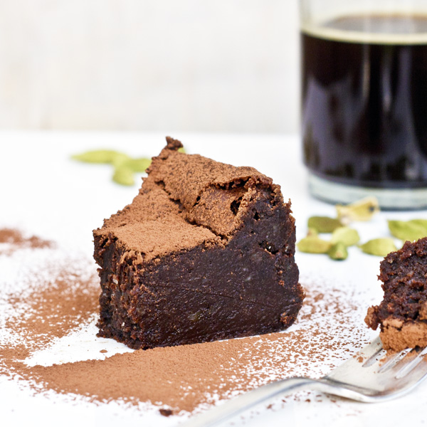 - Put the butter and chocolate in a large heatproof bowl. Stir the brown sugar and water together in a small saucepan. Bring to a boil over moderate heat. Immediately pour the boiling syrup over the chocolate and butter and stir until they’re completely melted. Mix in the egg yolks one at a time. Add the cardamom and espresso powder.