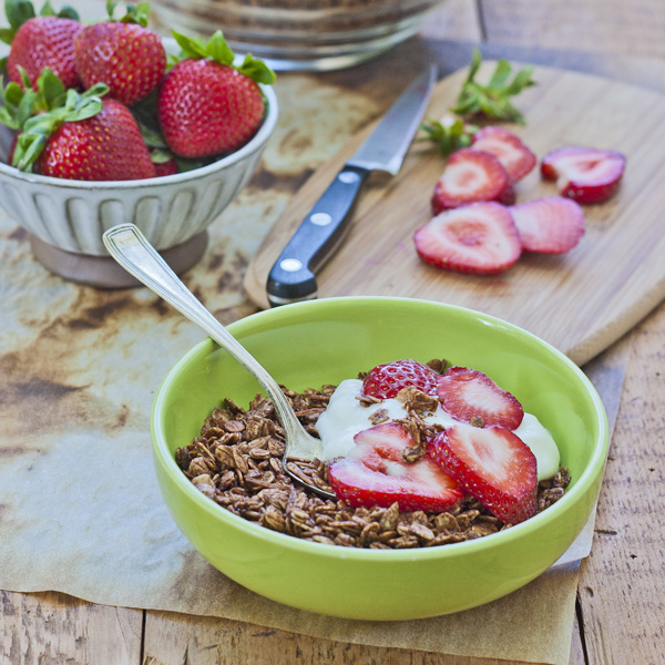 I’m downright giddy about this granola. I whipped it up Wednesday afternoon and ate a big bowl of it with strawberries and yogurt before the chocolaty oats even had a chance to cool. It’s sweet, but not cloyingly so, and that malt flavor is a return ticket to the best parts of my childhood. “Why don’t I use malt powder more often?” I thought as I scraped my way to the bottom of my first bowl. My plan was to snap a quick pic and immediately share it here with you. But life seldom goes as planned.